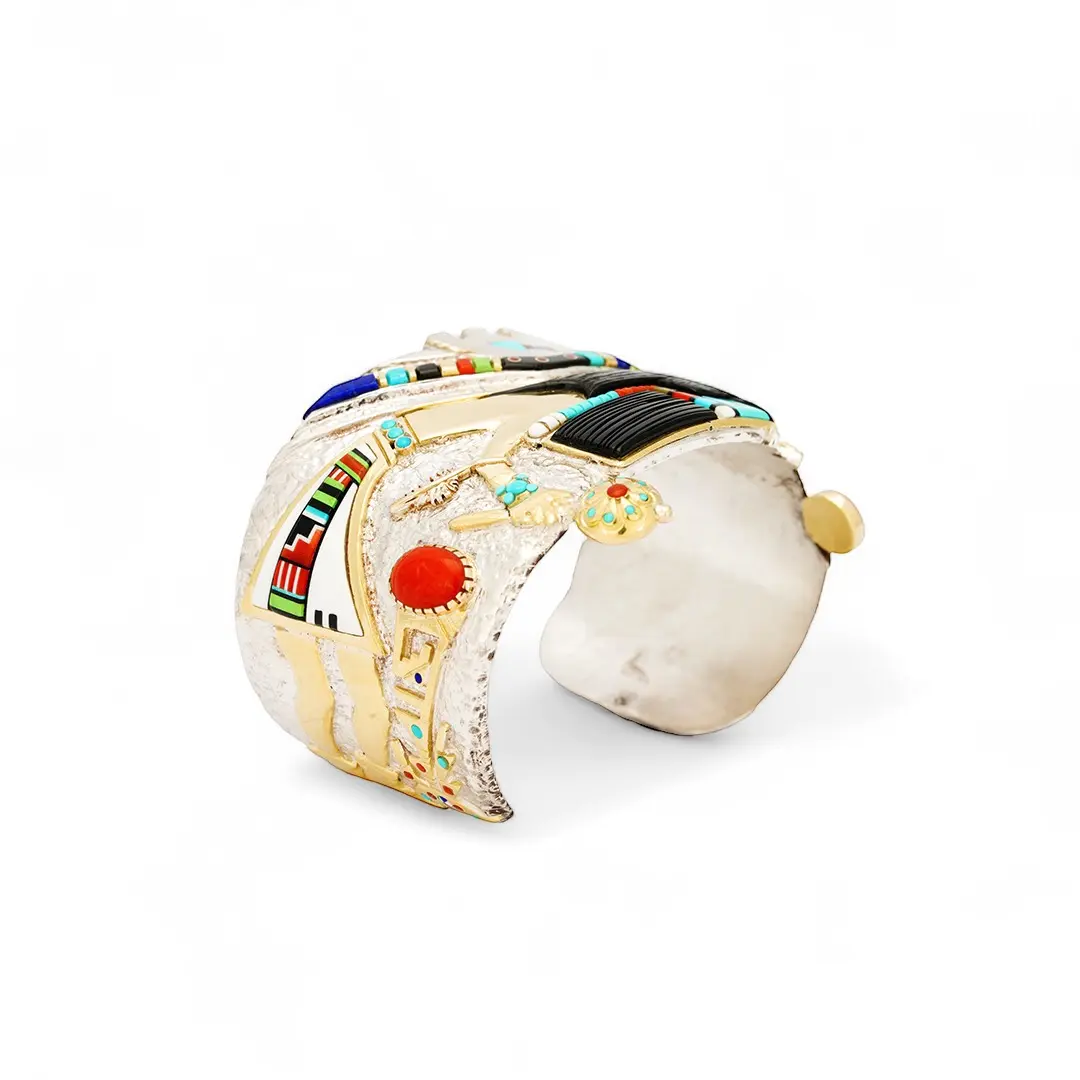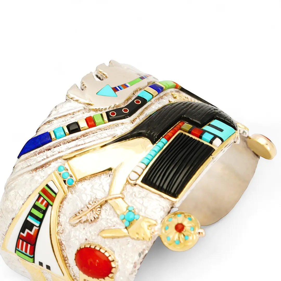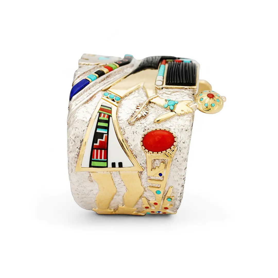 Shown on this bracelet, an inlaid set in 14k gold, the dancer wears a traditional-style kilt inlaid with turquoise, coral, shell, and black jade, symbolizing the spiritual traditions of American Indians. His outstretched arms and detailed regalia, formed in gold and inlay, evoke both motion and reverence.