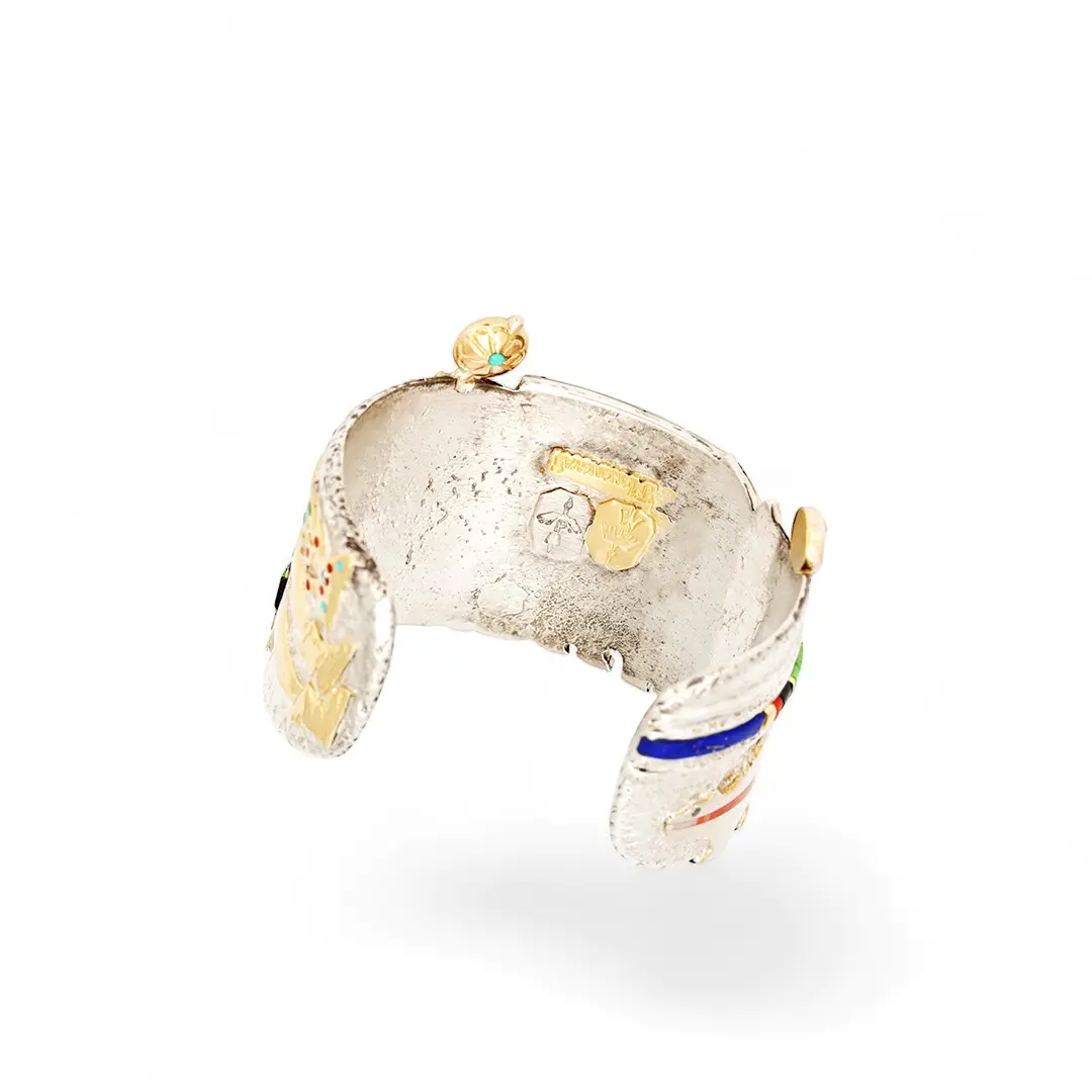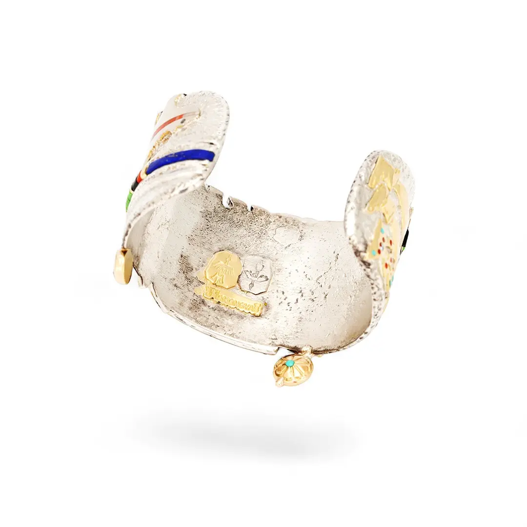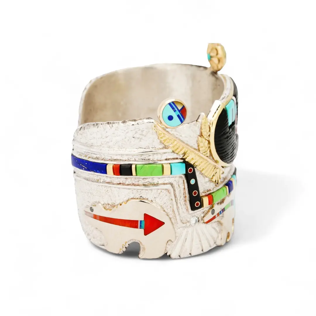 Shown on this bracelet, an inlaid set in 14k gold, the dancer wears a traditional-style kilt inlaid with turquoise, coral, shell, and black jade, symbolizing the spiritual traditions of American Indians. His outstretched arms and detailed regalia, formed in gold and inlay, evoke both motion and reverence.