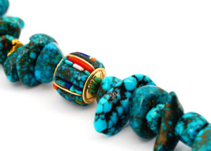 Below are two necklaces by Master American Indian jewelers Charles Loloma (Hopi B.1921-1991) and Raymond Yazzie (Navajo B.1959). These two necklaces feature a rare turquoise fossil. This turquoise stands out from other turquoise because it uniquely formed in a crinoid stem segments. When it was forming, the turquoise eroded and replaced the calcite, which formed these fossils. A crinoid is a long-stem seafloor animal comprising hundreds of segments. Both necklaces used Lone Mountain turquoise Fossils.