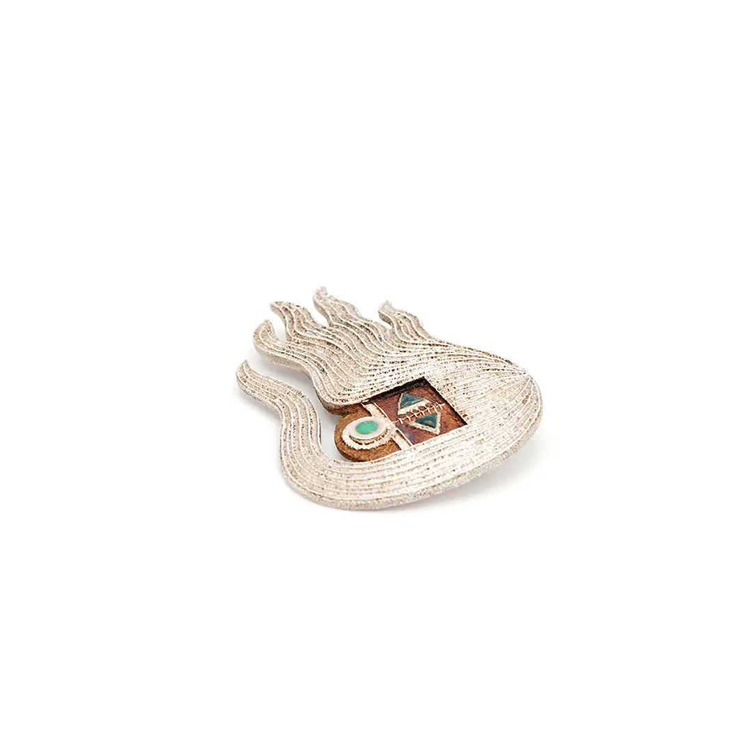 Ric Charlie is noted for his fine tufa cast work. His jewelry often has added colorful patinas in shades of gold, rust, red, purple, blue, and green, achieved by adding liver of sulfur to the silver. His pieces use Navajo landscape scenes, Yei Bi’Ci’s spiritual figures, and sand painting designs. The fine lines in his jewelry are accomplished by incising the tufa stone with the dental tools Ric has used for over 20 years. He uses a wide range of techniques, including mosaic, channel inlay, and set natural stones. Ric is also a painter and sculptor.